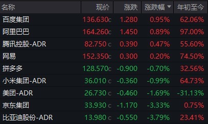 具体来看,阿里巴巴、百度等科技巨头股价均出现上涨,而京东、拼多多等电商股则出现下跌。此外,新能源汽车股表现也不尽如人意,蔚来汽车股价大跌超6%,理想汽车、小鹏汽车等也出现下跌。