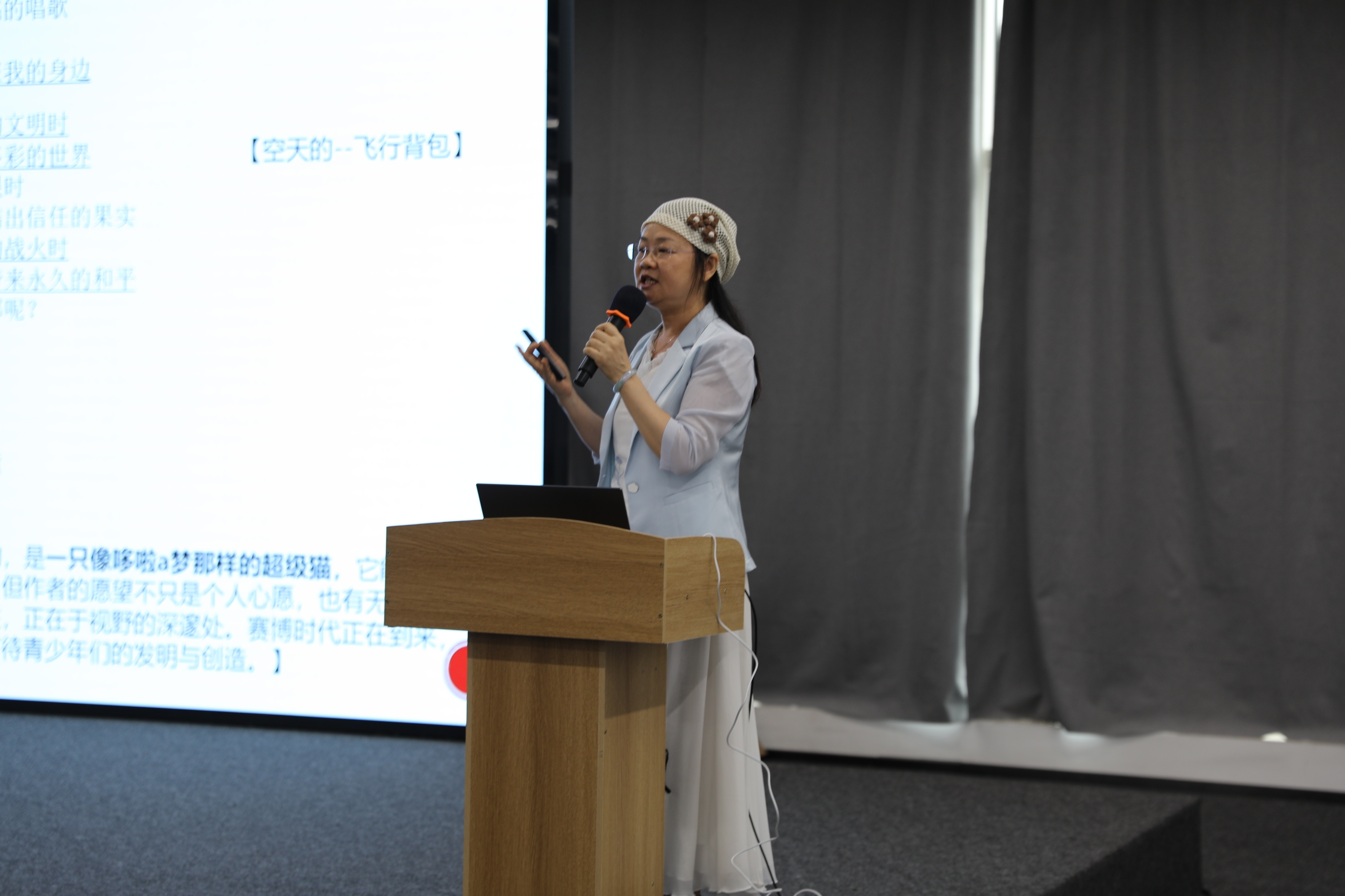 中国作家协会会员、诗人林馥娜以“诗性思维的能量”为题展开教学。她巧妙联结科技与诗歌的共通点:“就像风洞训练飞行器需要‘脑洞’,写诗也要打破常规想象。”通过解析AI主题童诗案例,引导学生将“飞行背包”“星际探索”等科技元素融入创作,点燃诗性火花。