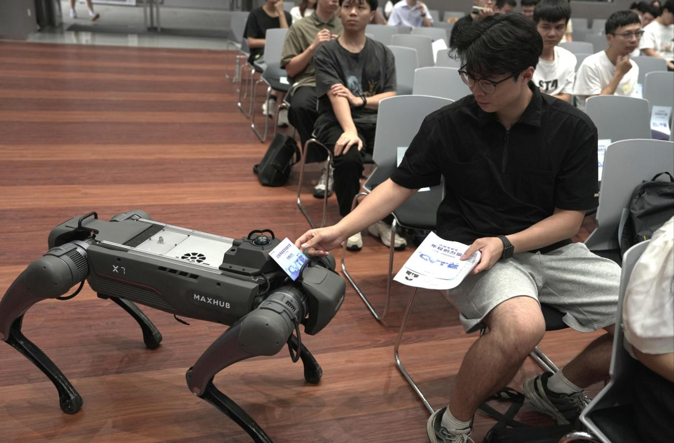 连日来,在深圳大学等专场宣讲会现场,来自视源股份的四足机器人MAXHUB X7自如地穿梭于人群中,不仅主动巡游互动、引导学生入场,还在关键环节担任“招聘嘉宾”,将面试直通卡精准递至参与提问的优秀学生手中。现场气氛一度被推向高潮,许多同学感概:“从来没想过招聘还能这么玩!”