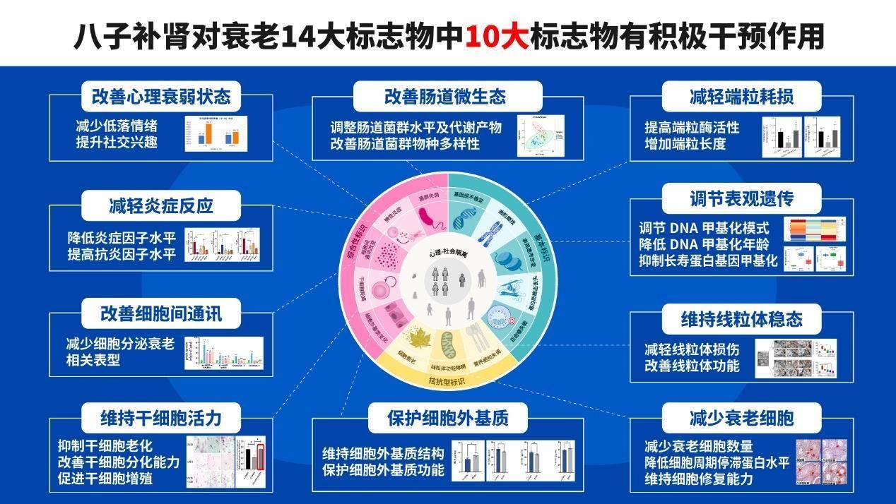 八子补肾突破了传统单一靶点的抗衰思路,从多维度、多层次系统干预衰老的生物学进程。系列研究表明,八子补肾能够同步作用于“减少衰老细胞”“维持线粒体稳态”“调节表观遗传”“维持干细胞活力”等十大衰老标志物,展现出整体调节的优势。