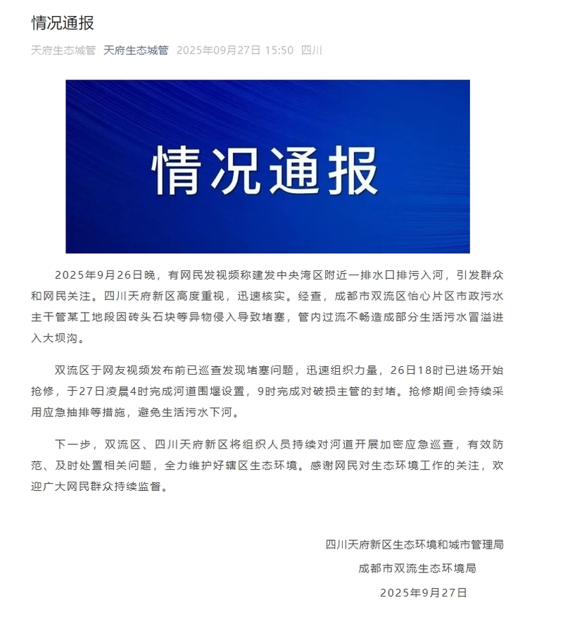 双流区于网友视频发布前已巡查发现堵塞问题,迅速组织力量,26日18时已进场开始抢修天天配资,于27日凌晨4时完成河道围堰设置,9时完成对破损主管的封堵。抢修期间会持续采用应急抽排等措施,避免生活污水下河。